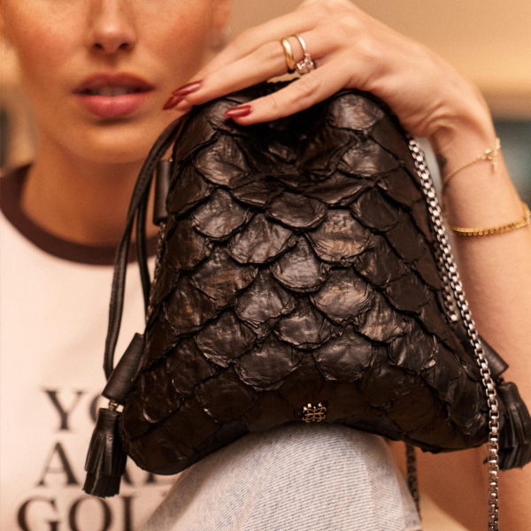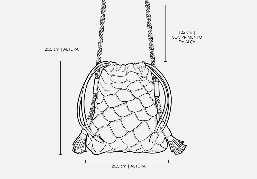 Relevo escamado, amarração no topo e corrente metálica garantem um visual único.