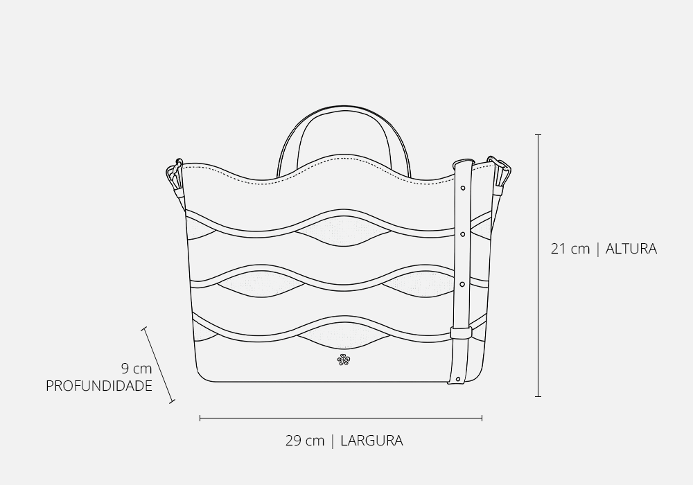Dimensões bolsa: 29 cm (largura) X 21 cm (altura) X 9 cm